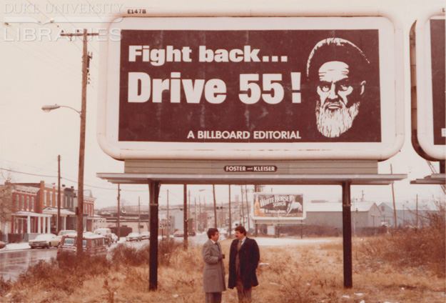 از مبتکر این تابلو سوال شد چرا عکس امام خمینی را در اتوبان های 20 ایالت آمریکا نصب کردی و این جمله را نوشتی؟ گفت: «ما با این کارمان قصد داشتیم نفرت مردم آمریکا را نسبت به این مرد زیاد کنیم؛ خواستیم غیرت آنها را بیدار کنیم و بگوییم بیشتر از 75 مایل سرعت، رانندگی نکنید تا در مصرف نفت خام وارداتی از ایران و کشورهای مسلمان خاور نزدیک صرفه جویی شود»! تلویزیون آمریکا هم هرشب بین 5 تا40 دقیقه در این ارتباط تبلیغ می کرد.»